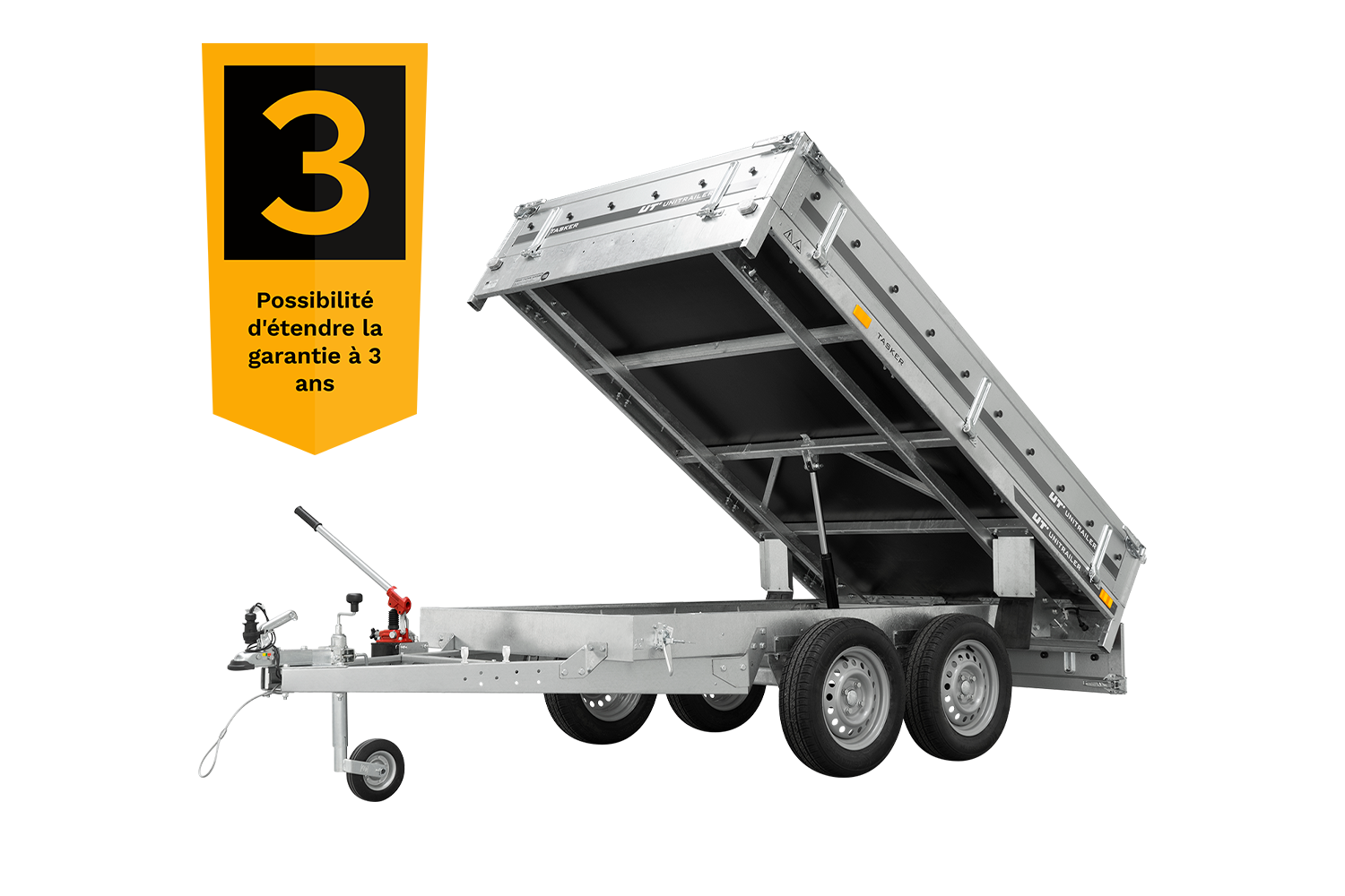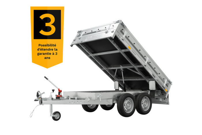 La roue de support facilite la manœuvre de la remorque debout. La remorque TASKER 250/2 a une fonction de basculement avec un actionneur hydraulique manuel.