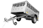 Grande remorque à benne basculante avec bâche plate, rehausses de ridelles grillagées et roue jockey du modèle Garden Trailer 201 KIPP. Grâce à la grande surface de transport de 200×125 cm, la remorque vous permettra de transporter de lourdes charges ou d’objets de grandes dimensions qui ne seraient normalement pas transportables dans votre voiture.